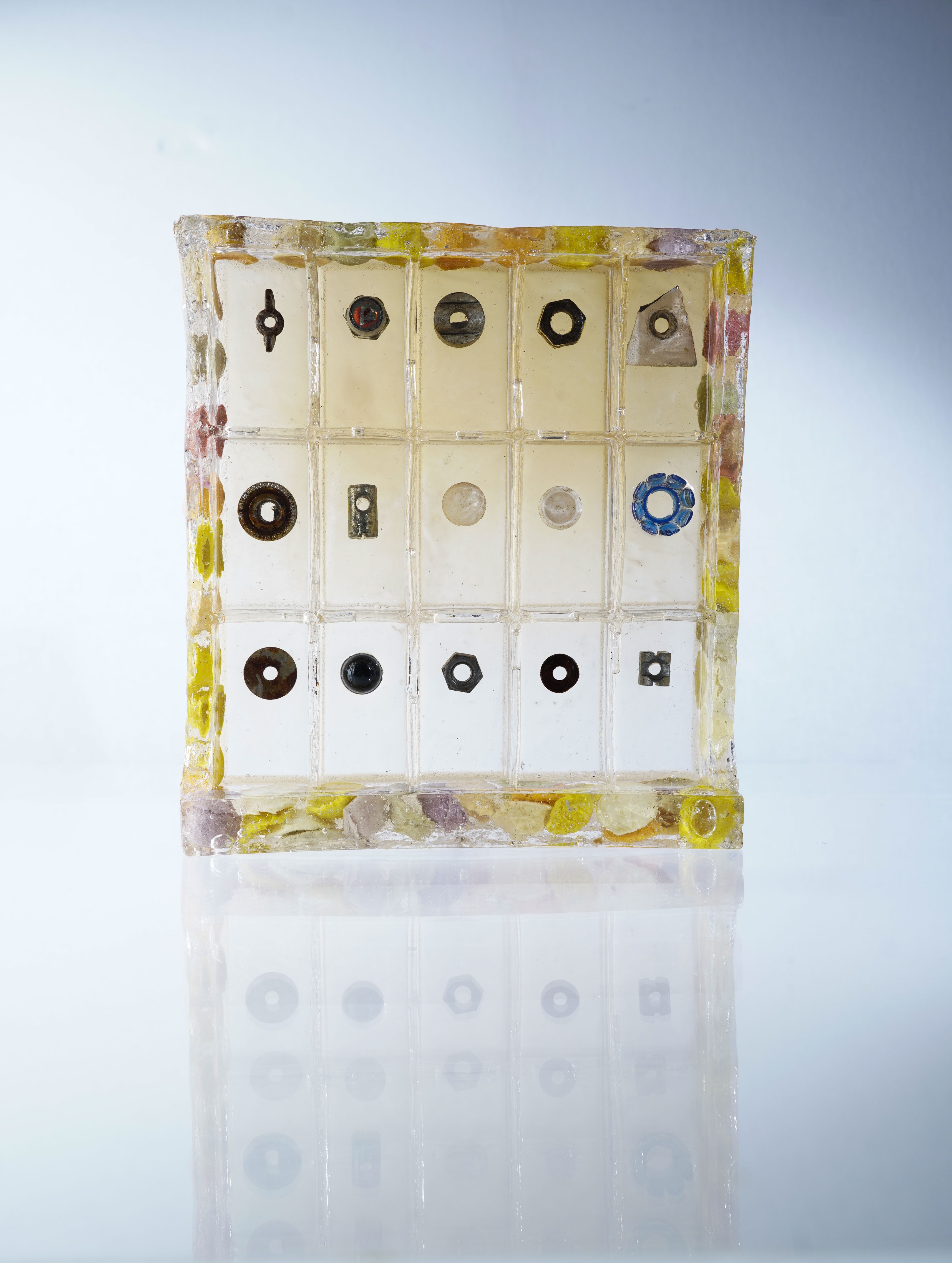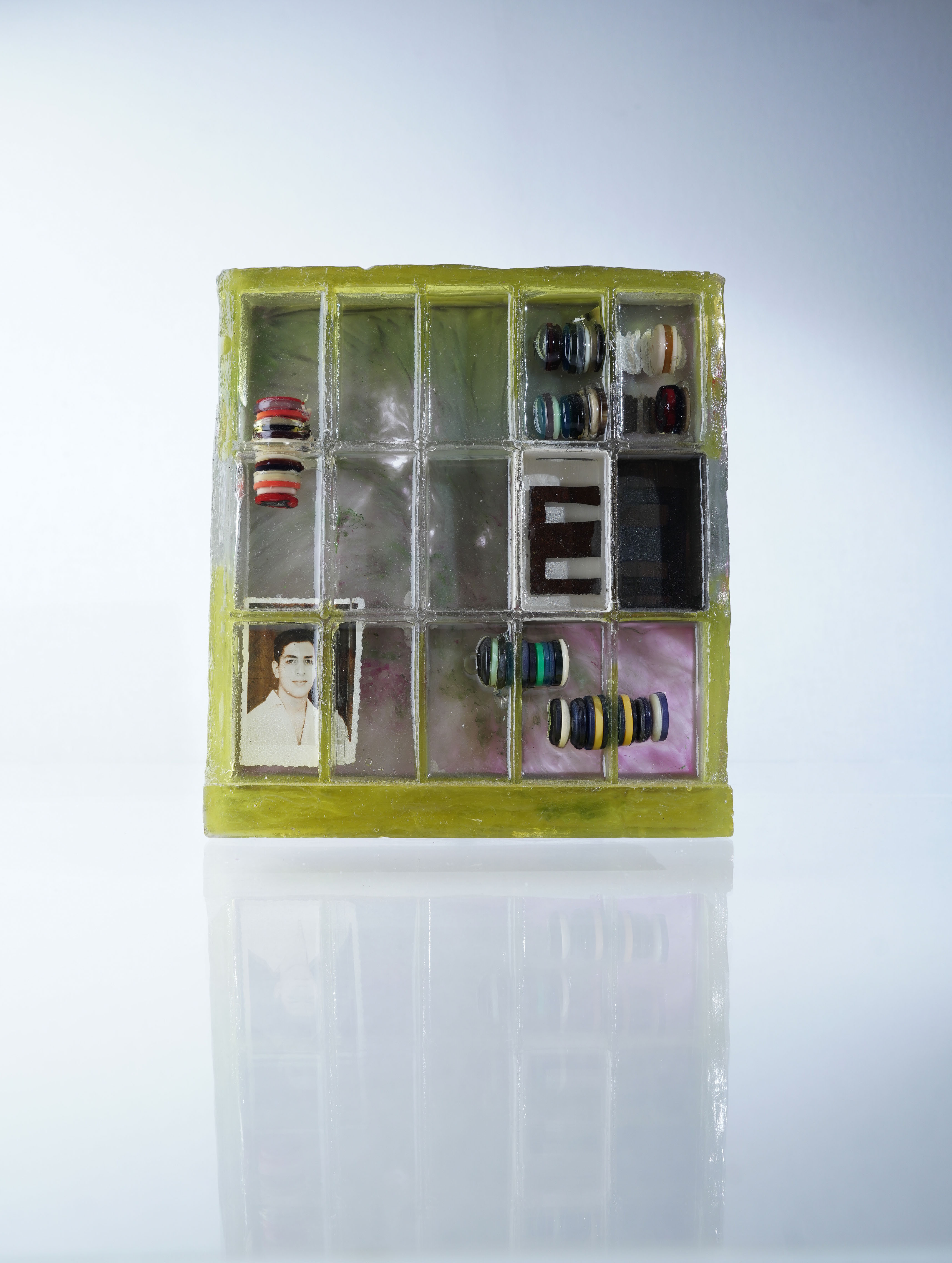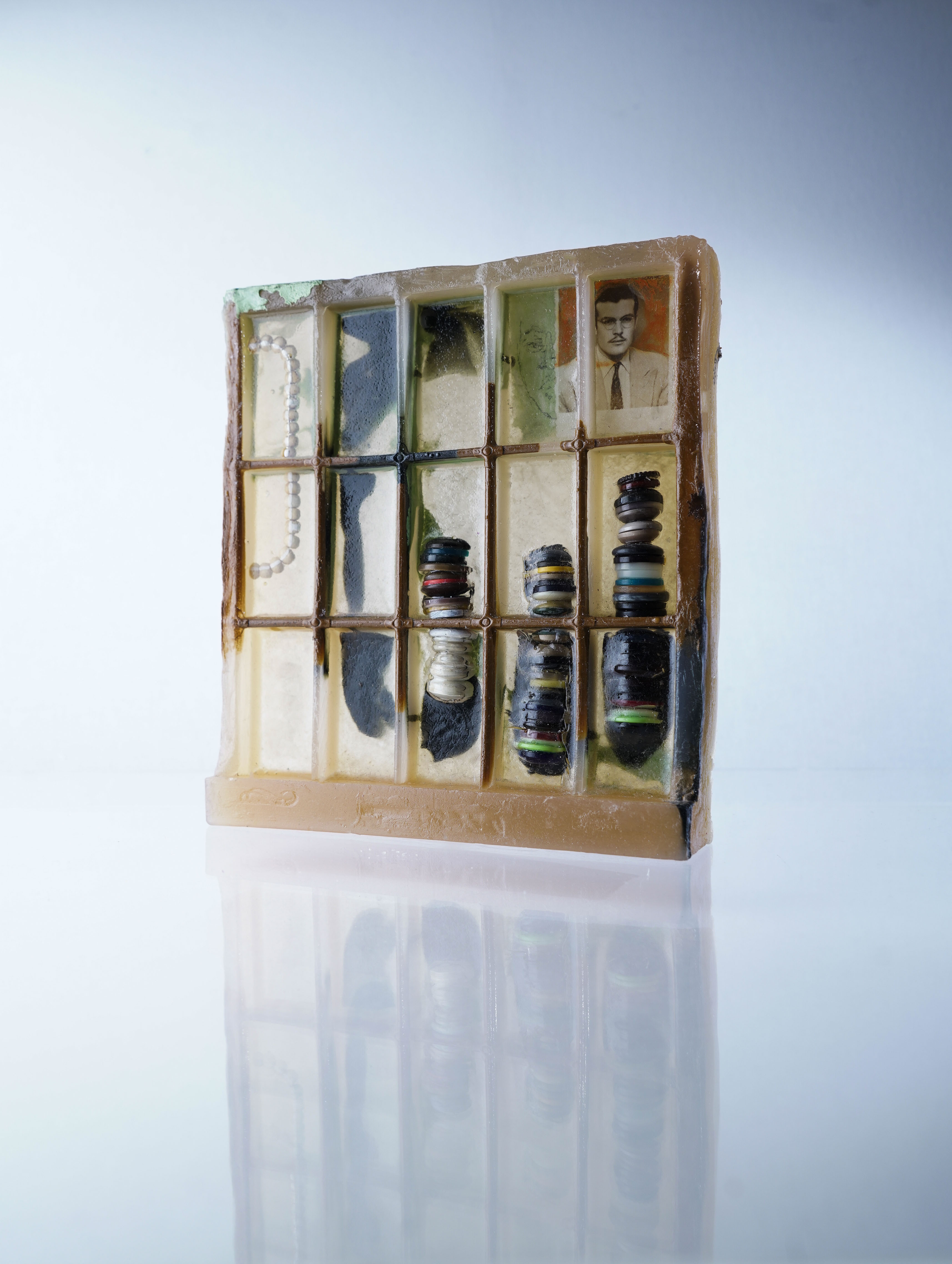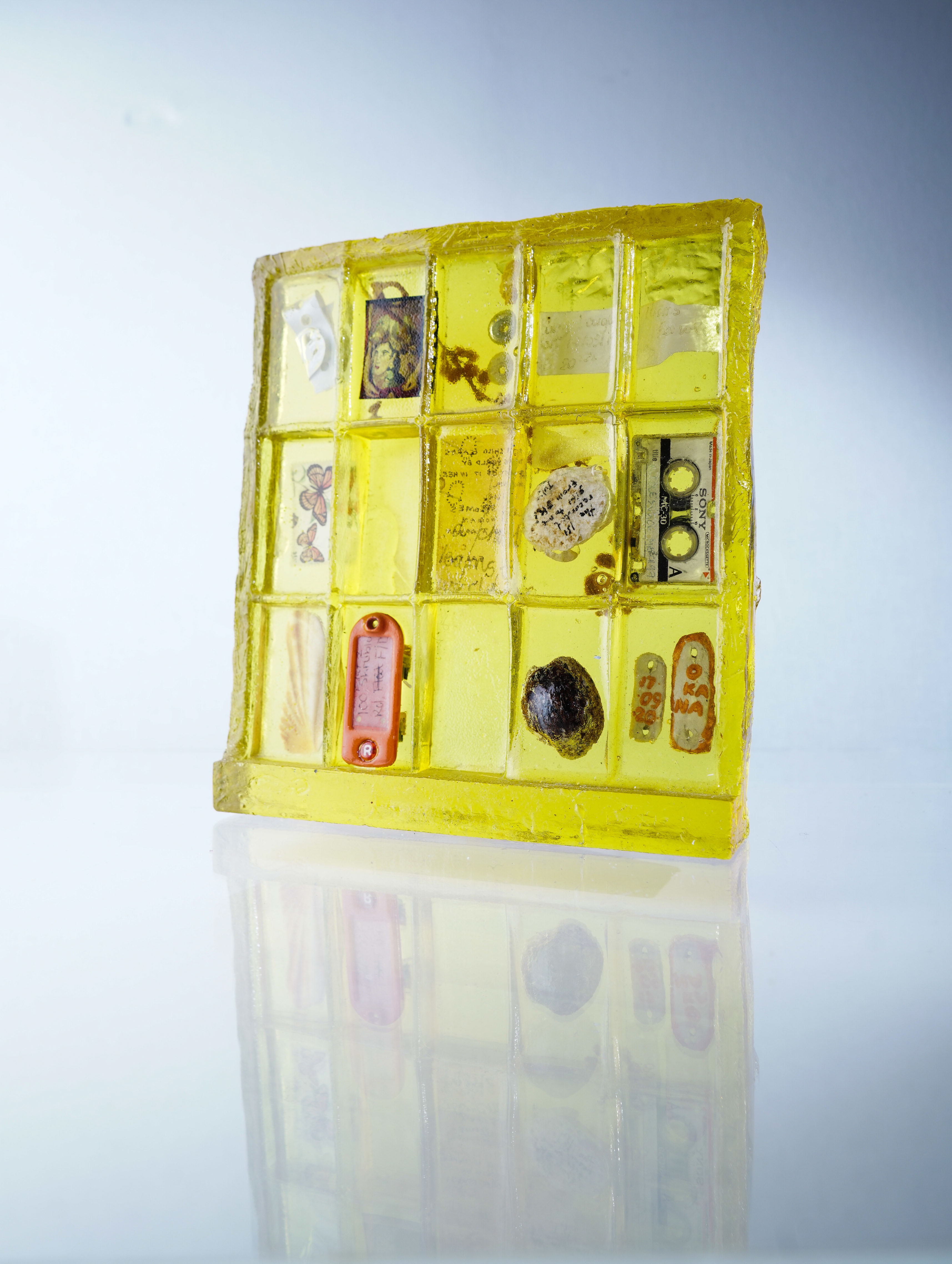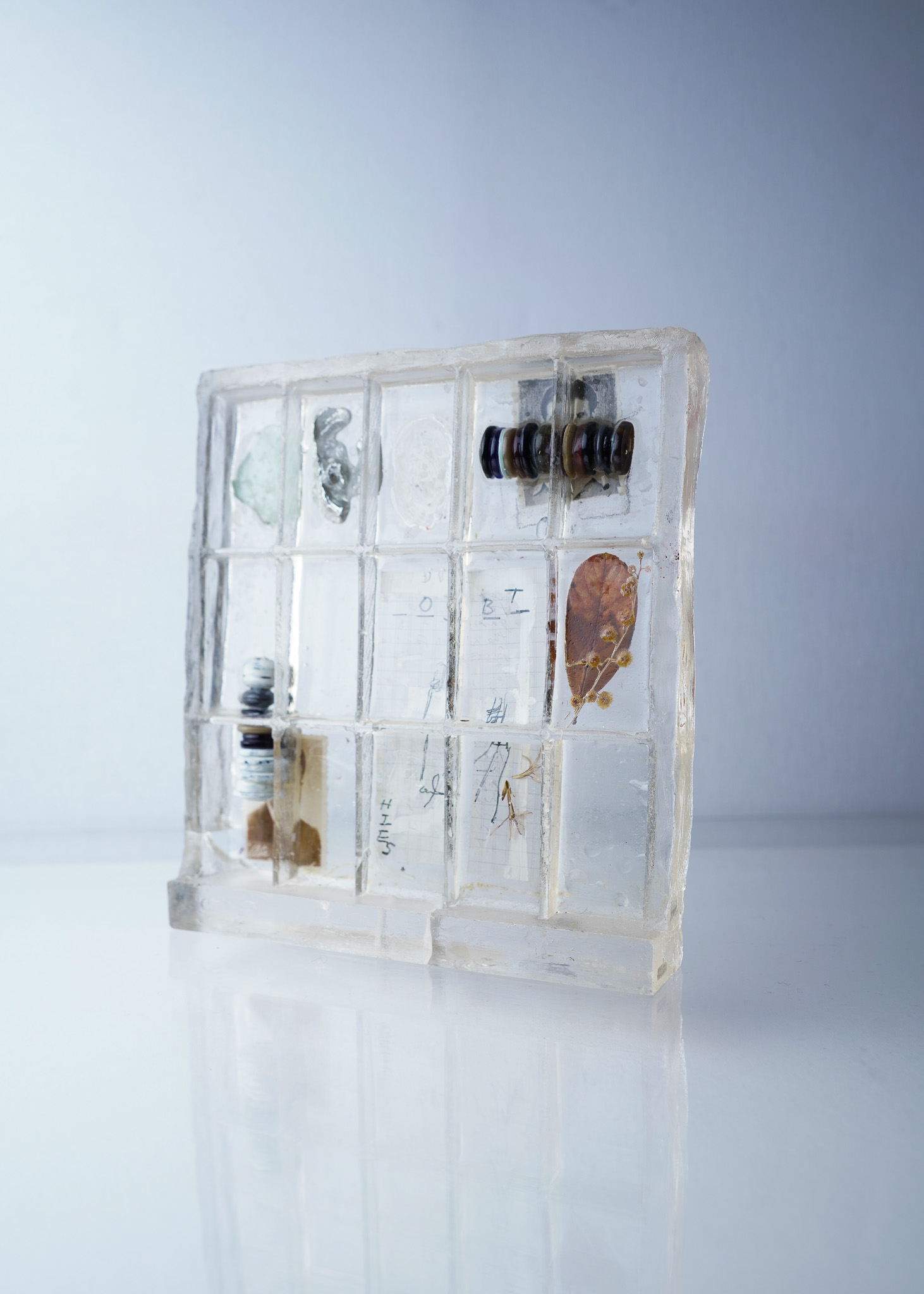 These memories were awoken from my subconscious some ten years on, upon finding a beaten leather wallet on the 136 bus in Elephant and Castle. The wallet contained only an old blood-type card and a number of family ID pictures. Strong facial features laced through the three generations of ID photos. After failing to get through to the inactive numbers scribbled along with some Portuguese writing, I placed these pictures in resin and began to investigate the preservation of the traces memories leave behind. I hope now to expand into the archives and memories of others- creating heirlooms to be passed on, encapsulating objects that may otherwise be left untouched, collecting dust in an attic.